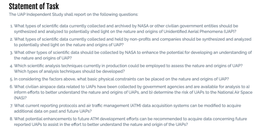 “And so this independent study panel … all with a specific charge from me, which is to tell how to apply the full focus of science and data to UAP. This is the first time NASA has taken concrete action to seriously look into UAP.”