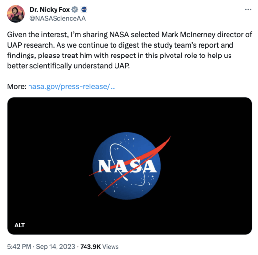 Dr. Nicola Fox, Associate Administrator, Science Mission Directorate, Forward to the report: Unidentified Anomalous Phenomena (UAP) are one of our planet’s greatest mysteries. Observations of objects in our skies that cannot be identified as balloons, aircraft, or natural known phenomena have been spotted worldwide, yet there are limited high-quality observations. The nature of science is to explore the unknown, and data is the language scientists use to discover our universe’s secrets. Despite numerous accounts and visuals, the absence of consistent, detailed, and curated observations means we do not presently have the body of data needed to make definitive, scientific conclusions about UAP. … NASA is appointing a Director of UAP Research to centralize communications and leverage NASA’s extensive resources and expertise to actively engage in the whole-of-government UAP initiative. This individual will also ensure that the agency’s vast analytical capabilities, including its proficiency in data management, machine learning and artificial intelligence, are contributed to the government’s unified UAP effort.