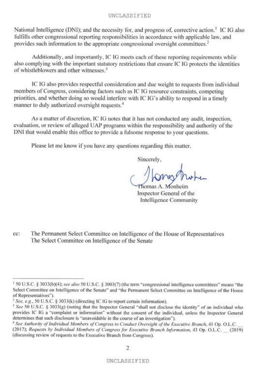 Yes. I know what that is. (Laughter.) Well, without speaking to proposed legislation – I won’t do that – as you know, the Pentagon has stood up an entire organization to help collate and coordinate the reporting and analysis of – of sightings of UAP across the military. Before that, there wasn’t really a coordinated, integrated effort to do that.And, of course, we will always want to be as transparent with members of Congress and with the American people as we can, considering national security concerns.